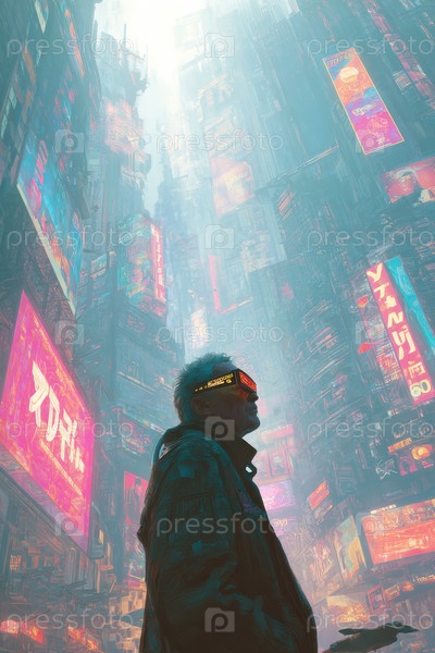 Футуристическая городская сцена с мужчиной в неоновых очках на фоне яркого освещения города