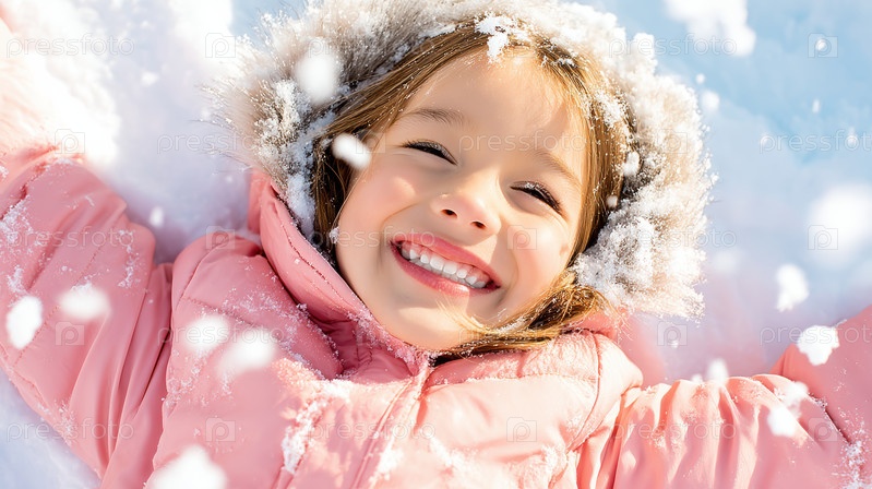 Веселая молодая девушка сияет теплой улыбкой, счастливо играя вокруг себя в свежем пушистом снегу