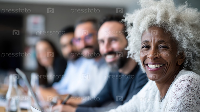 Разнообразная группа профессионалов, активно участвующих в продуктивной и совместной встрече с использованием цифровых элементов