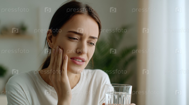 Женщина, страдающая от боли, нежно держит в руке стакан освежающей воды