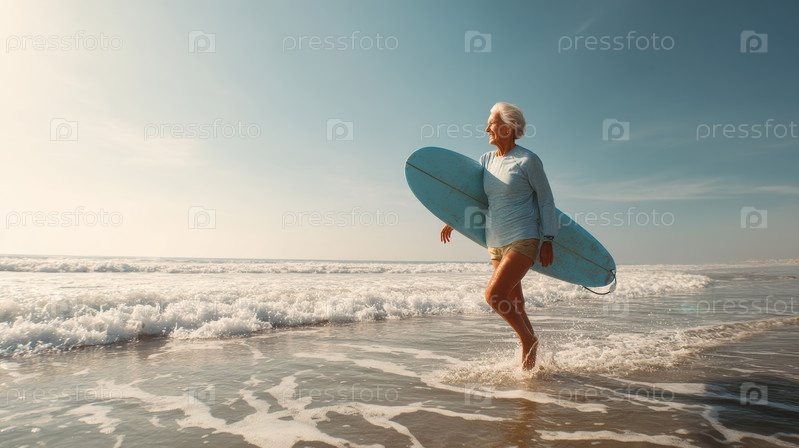 Веселая пожилая женщина с энтузиазмом серфирует на пляже, обнимая свою страсть к приключениям и фитнесу A