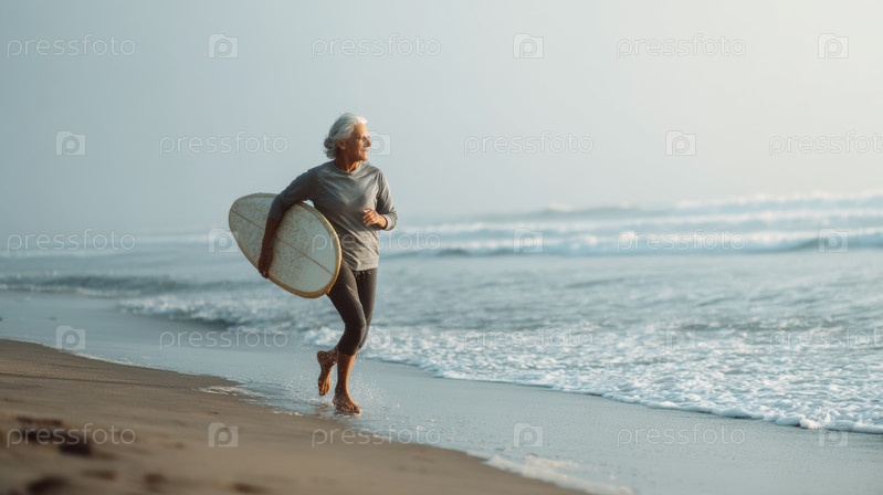 Веселая пожилая женщина отлично проводит время, занимаясь серфингом на пляже, ярко демонстрируя свой активный и динамичный образ жизни