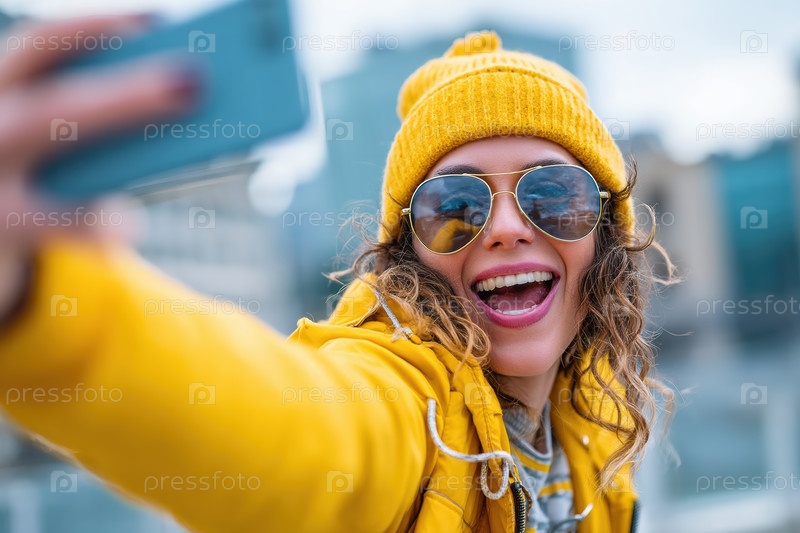 Веселая молодая женщина с энтузиазмом делает яркое селфи в стильном красочном свитере и модных солнцезащитных очках A