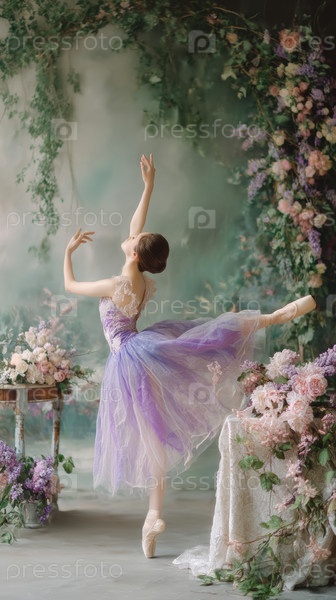 Грациозная балерина позирует изысканно в прекрасно освещенной солнечным светом, винтажной комнате вокруг красочных цветов