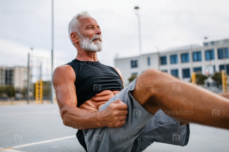Активный пожилой мужчина выполняет тренировку на улице в яркой спортивной одежде, поощряя фитнес и здоровый образ жизни