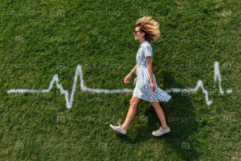 Женщина в оранжевом наряде элегантно прогуливается по живописному поле, а график сердечных сокращений перекрывает сцену