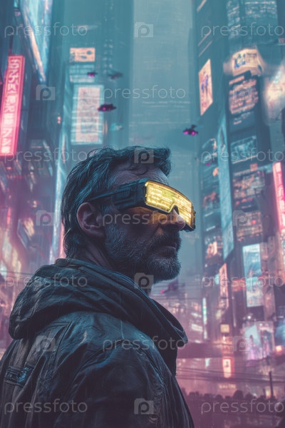 Футуристическая городская сцена с мужчиной в неоновых очках на фоне яркого освещения города
