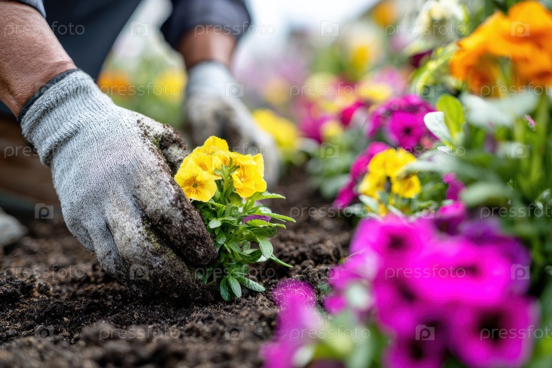 Преданный огородник тщательно сажает яркие цветы в богатую, плодородную почву красивого сада