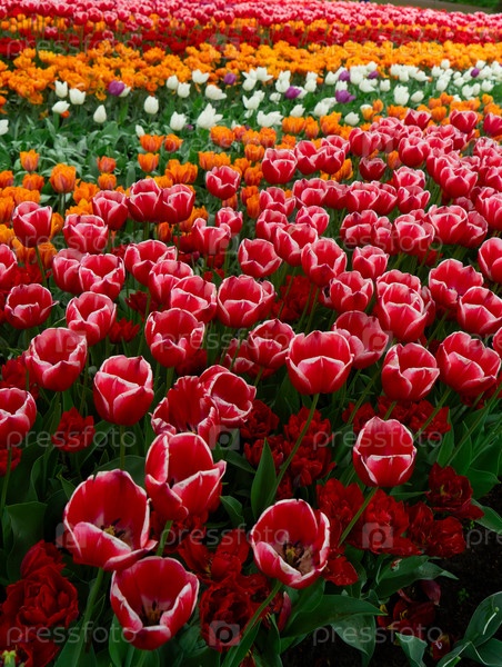 Знаменитое голландское многоцветное поле тюльпанов с рядами в солнечный день с голубым небом