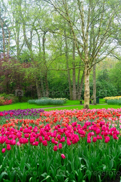 Красочный путь в саду тюльпанов, демонстрирующий яркие цветы в пышной обстановке, приглашает посетителей исследовать