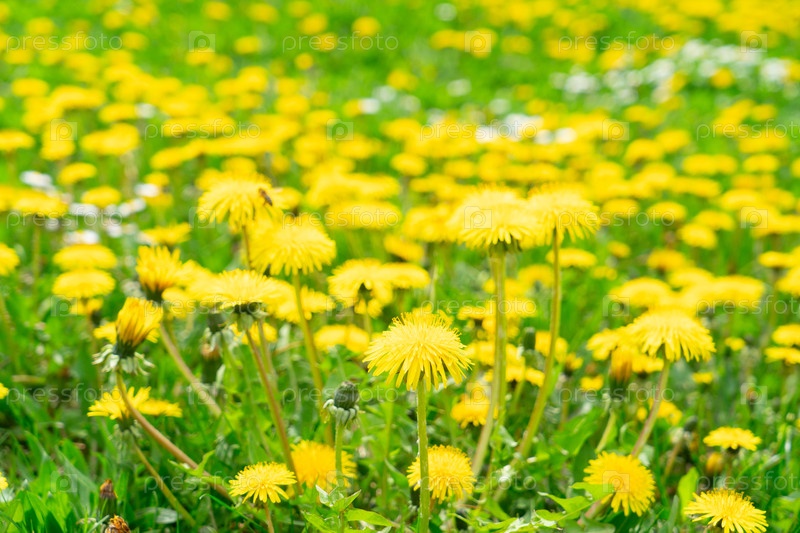 Желтая луга одуванчиков на солнечном свете, обширное поле ярких цветов и свежая зеленая трава, лованглейский ближайший снимок с многочисленными кветочными головками, мягкий боке