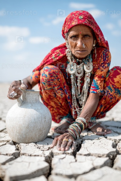 Женщина собирает воду в сухом ландшафте, демонстрируя проблемы засухи и миграции для выживания