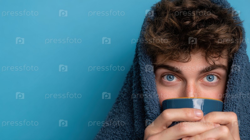 Прекрасно уютный момент захвачен человеком, с любовью завернутым в мягкое одеяло во время выпивки теплого напитка