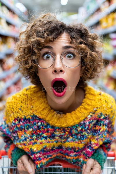 Женщина выражает свой шок и удивление в оживленном продуктовом магазине, который переполнен свежими продуктами