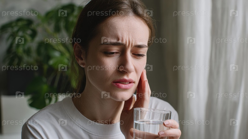 Женщина, страдающая от боли, нежно держит в руке стакан освежающей воды