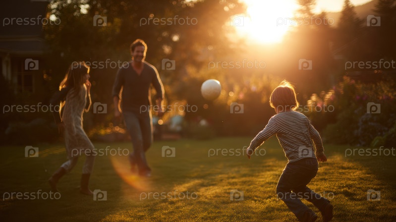 Веселая семья счастливо наслаждается оживленной игрой в футбол вместе на своем просторном заднем дворе под теплым солнцем