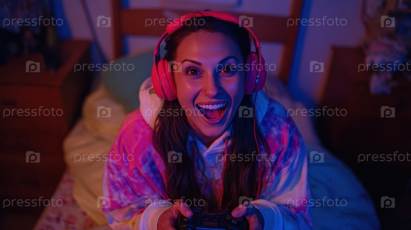 Взволнованный геймер носит наушники страстно играет в видеоигры с энтузиазмом
