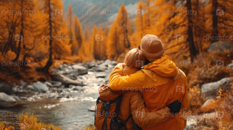 Прекрасная пара обнимает друг друга у безмятежной реки, окруженной яркими цветами осени