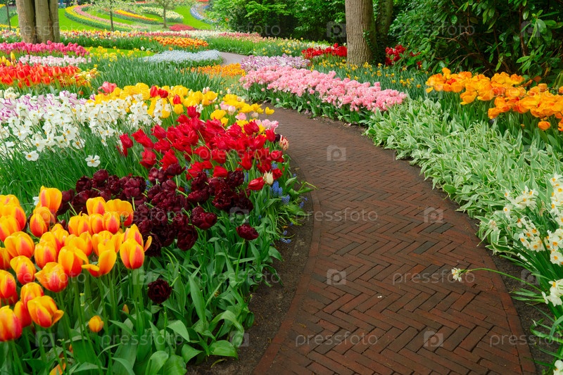 Красочный путь в саду тюльпанов, демонстрирующий яркие цветы в пышной обстановке, приглашает посетителей исследовать