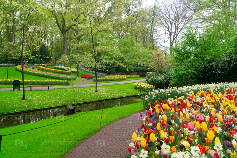 Красочный источник с чистой водой в саду тюльпанов, демонстрирующий яркие цветы в пышной обстановке и приглашающий посетителей исследовать