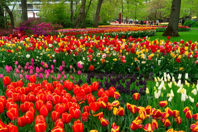 Знаменитое голландское поле тюльпанов с рядами в солнечный день с голубым небом