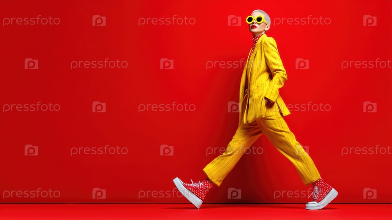 Стильный человек в желтом костюме и красных солнцезащитных очках излучает уверенность на ярко-красном фоне