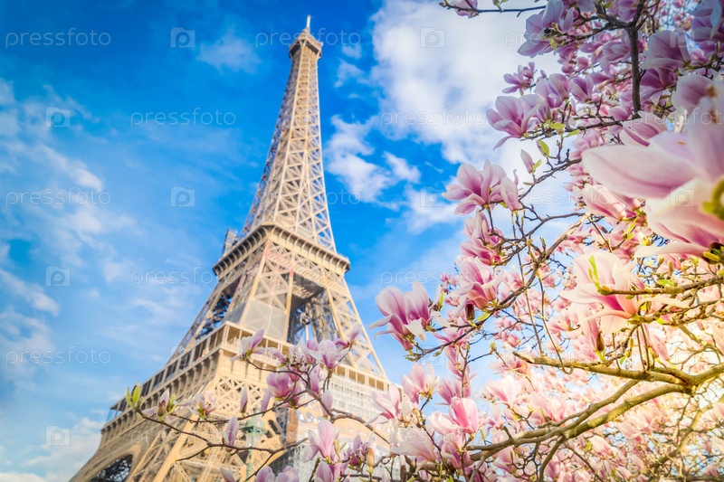 Эйфелева башня с цветущими весенними цветами магнолии, Париж, Франция