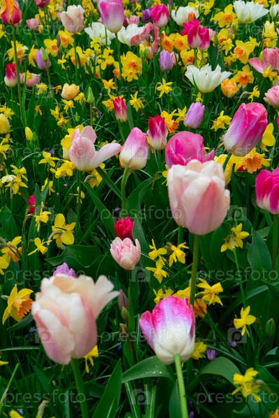 Знаменитое голландское многоцветное поле тюльпанов с рядами в солнечный день с голубым небом