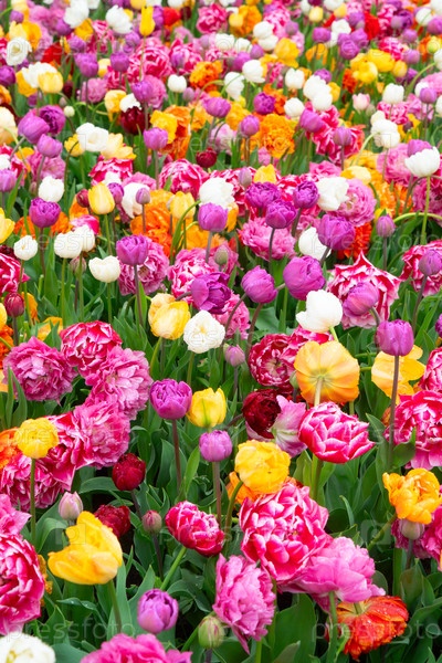 Знаменитое голландское многоцветное поле тюльпанов с рядами в солнечный день с голубым небом
