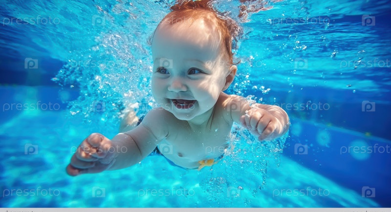 Счастливый ребенок игриво и радостно плавает под водой в чистом и привлекательном голубом бассейне