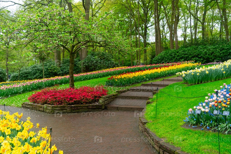 Путь через яркий сад тюльпанов в полном цветении во время восхитительного весеннего сезона захватывает дух