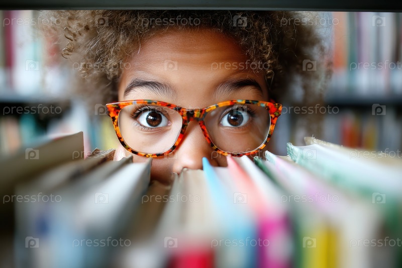 Любопытный маленький ребенок с волнением просматривает книги в прекрасной библиотеке, наполненной бесконечными знаниями