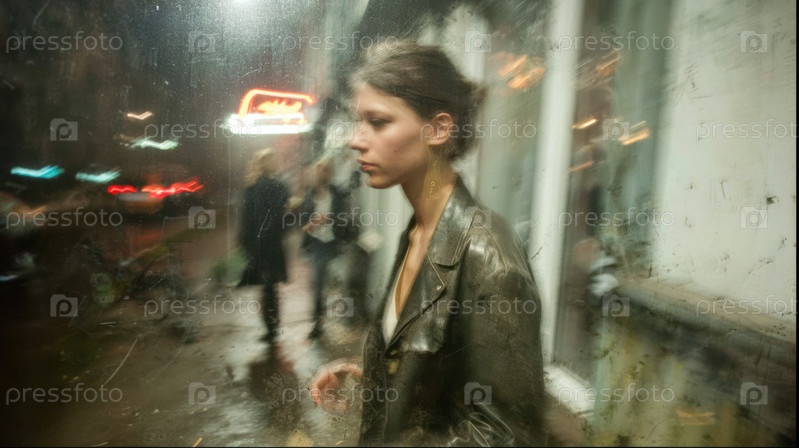 В дождливую ночь молодая женщина грациозно идет по блестящей улице, освещенной яркими городскими огнями