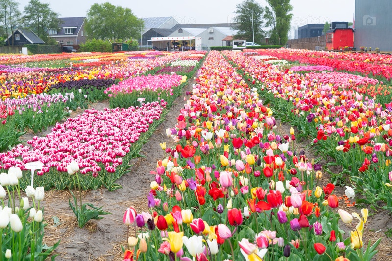 Знаменитое голландское многоцветное поле тюльпанов с рядами в солнечный день с голубым небом