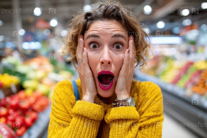 Женщина выражает свой шок и удивление в оживленном продуктовом магазине, который переполнен свежими продуктами