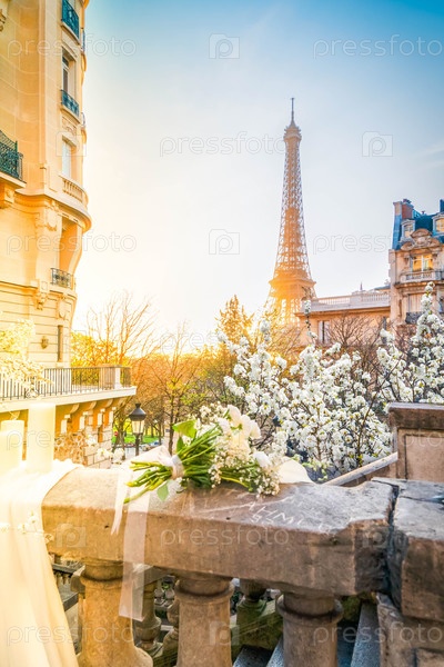 Уютная парижская улица с видом на знаменитую Эйфелеву башню в весенний день с белыми цветочными украшениями, Париж Франция