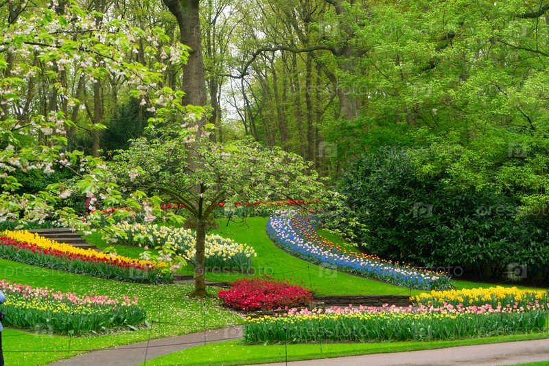 Красочный путь в саду тюльпанов, демонстрирующий яркие цветы в пышной обстановке, приглашает посетителей исследовать