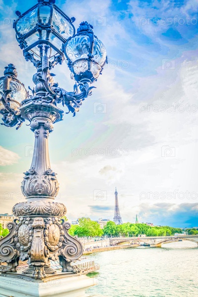 Детали знаменитого моста Александра III и Эйфелевой башни, Париж, Франция