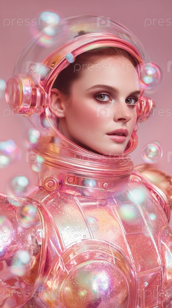 Визионистский футуристический астронавт, украшенный розовым костюмом, элегантно окруженный множеством радужных пузырей