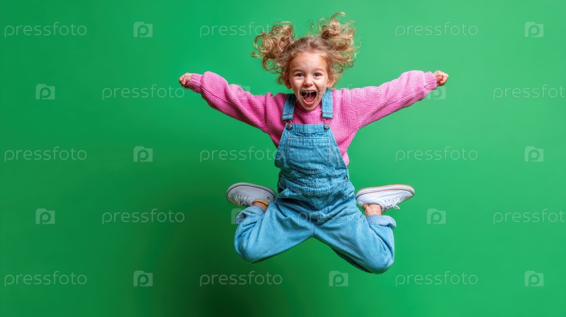 Радостный ребенок прыгает против яркого и веселого наружного фона счастья и энергии