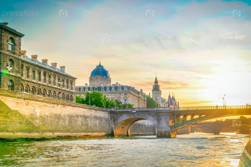 Мосты Парижа и реки Сены при солнечном летнем закате, Париж, Франция с солнцем