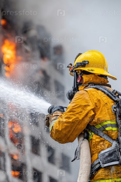 Смелый пожарный умело использует мощный шланг, чтобы контролировать бушующие пламени на фоне дыма, опасности и жары