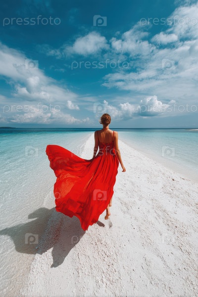 Элегантная женщина в красивом красном платье гуляет грациозно на пляже при восходе солнца, обнимая момент