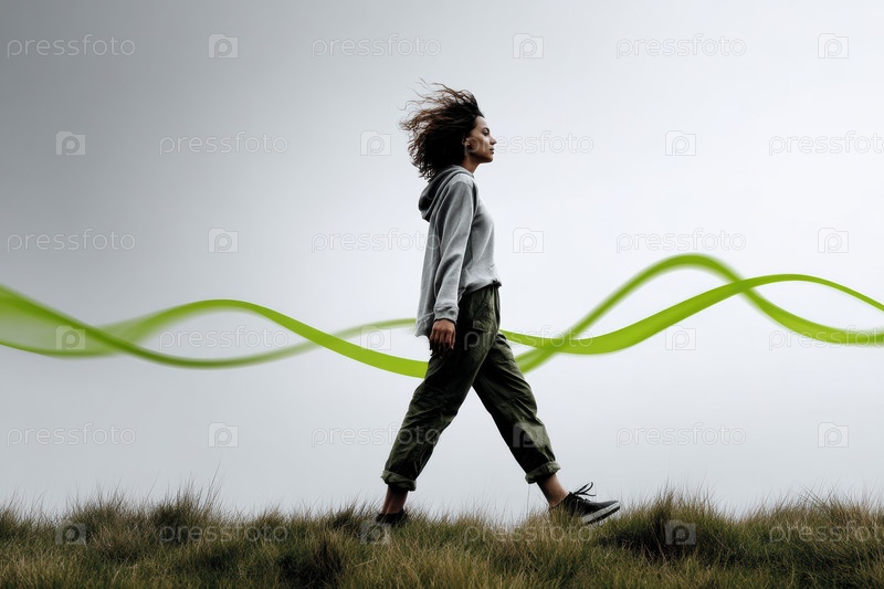 Женщина изящно ходит по безмятежному поле, украшенному линией сердцебиения, символизирующей суть жизни и жизненной силы