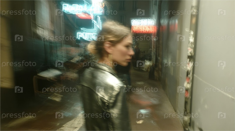 В дождливую ночь молодая женщина грациозно идет по блестящей улице, освещенной яркими городскими огнями