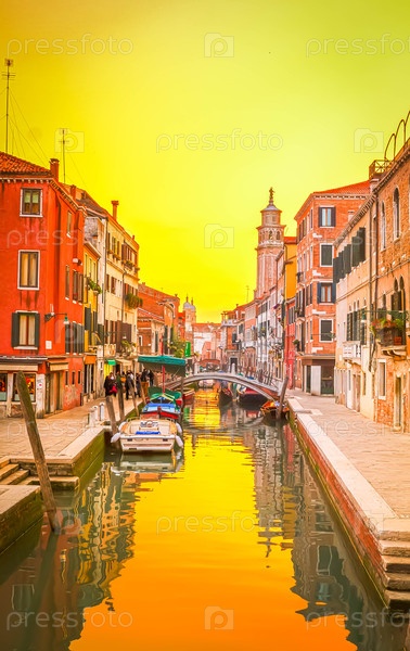 Традиционные венецианские дома над водой небольшого канала в старом городе на закате, Италия