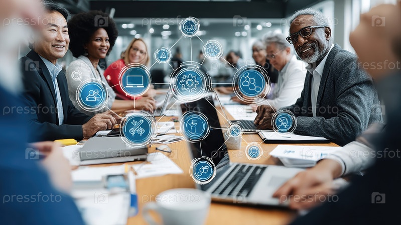 Разнообразная группа профессионалов, активно участвующих в продуктивной и совместной встрече с использованием цифровых элементов