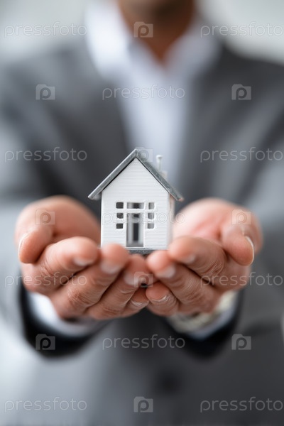 Эксперт демонстрирует миниатюрный дом, символизирующий ценные услуги недвижимости и собственность на жилье