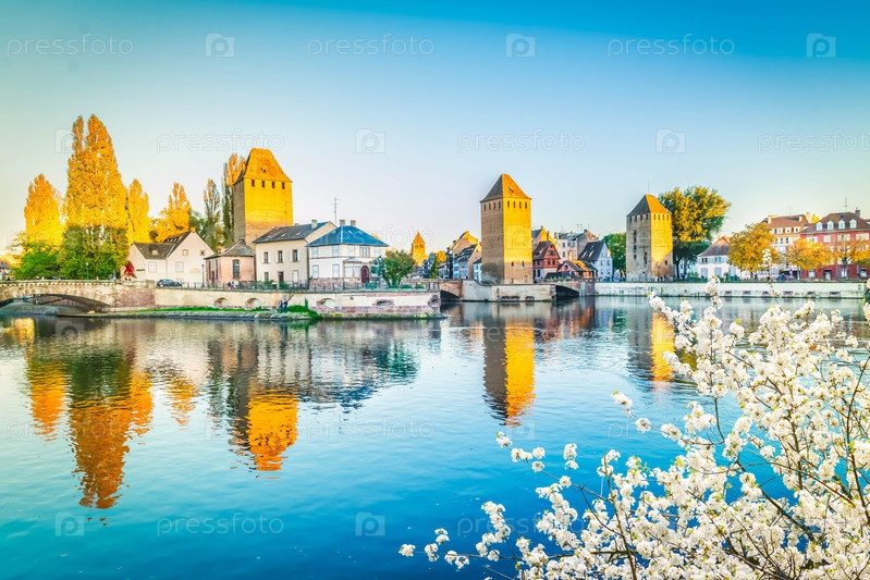 Вид на мост Ponts Couverts с отражением Страсбурга весной, Франция