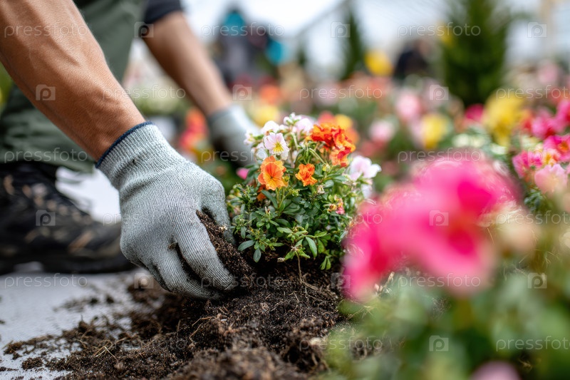 Преданный огородник тщательно сажает яркие цветы в богатую, плодородную почву красивого сада